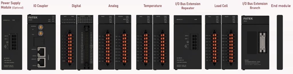 Powerful Control Over Scale and Extensibility These modules can control up to 2048 Digital I/O (DIO) and 256 Analog I/O (AIO), and support up to 64 expansion modules of various types. With FHB (FATEK Hyper-Bus) technology, FATEK ensures instant data transfer, allowing smooth monitoring of large-scale control systems without any delays.